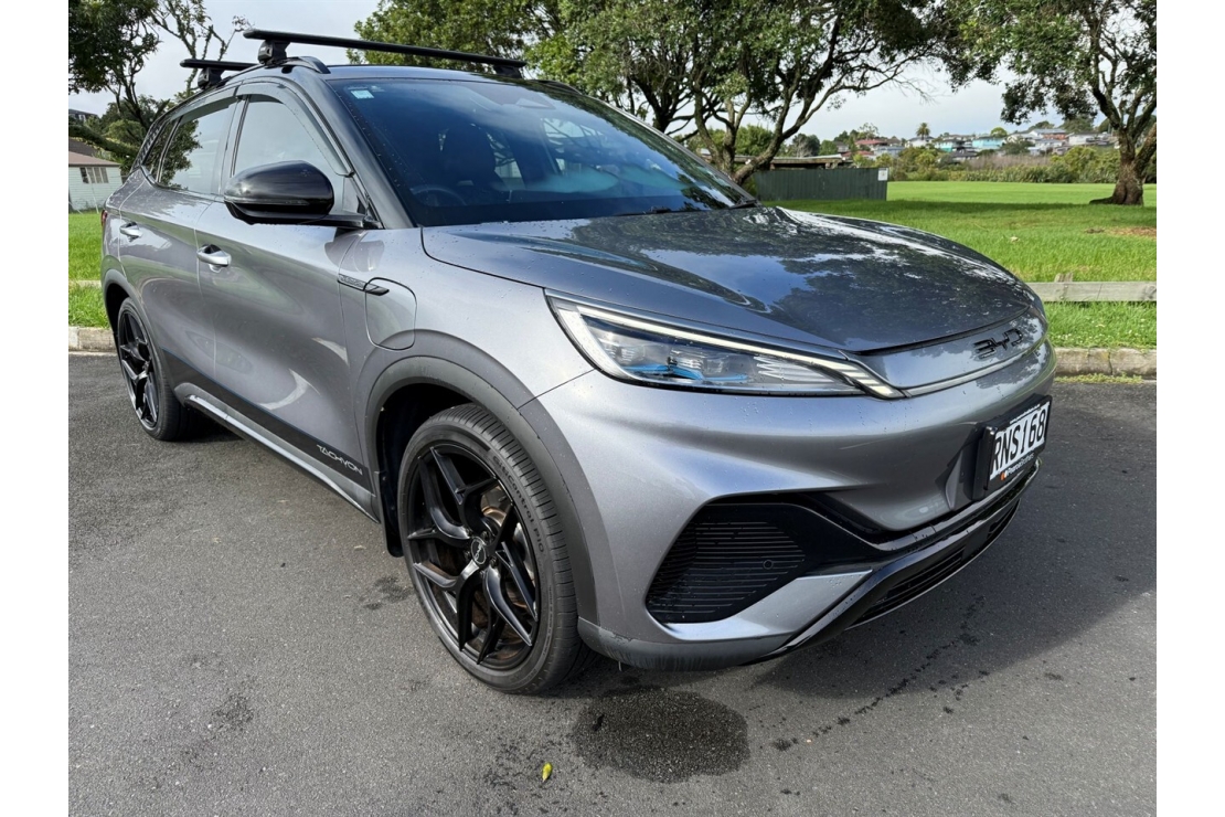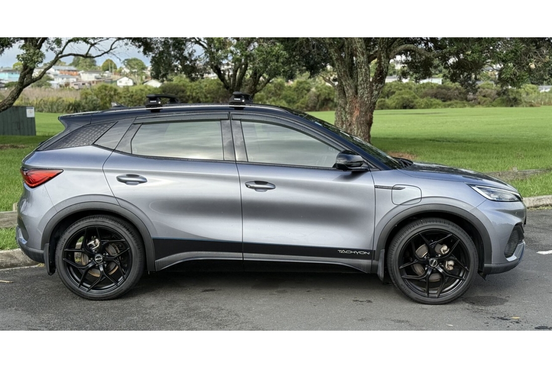 This New Zealand new 2023 BYD Atto 3 Tachyon Extended Range is a standout electric SUV, finished in sleek metallic grey and sitting on bold 20 inch alloy wheels. With roof racks, tinted windows, monsoon shields, and a tow bar, this Atto 3 blends modern EV technology with everyday practicality.