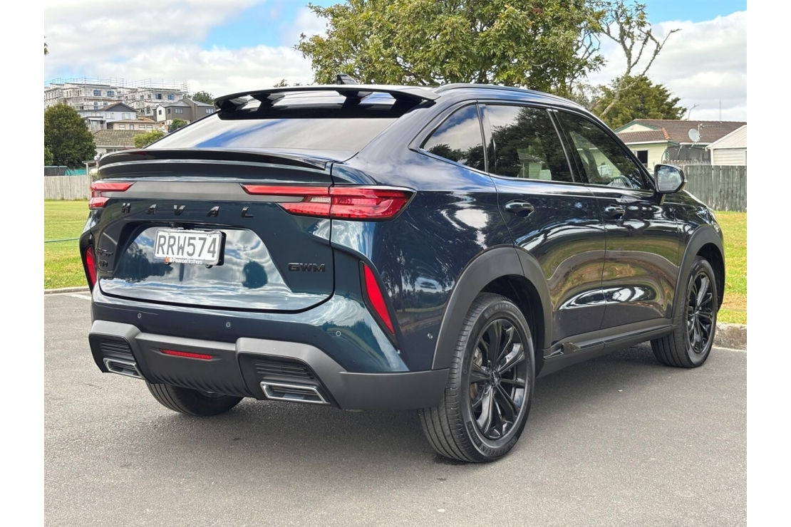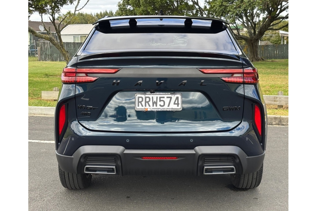 NZ new 2022 Haval H6 GT Ultra in metallic green with custom blackout styling is a sporty modern SUV. Sitting on 19 inch alloy wheels with a rear spoiler, tinted windows, and dual rear exhaust