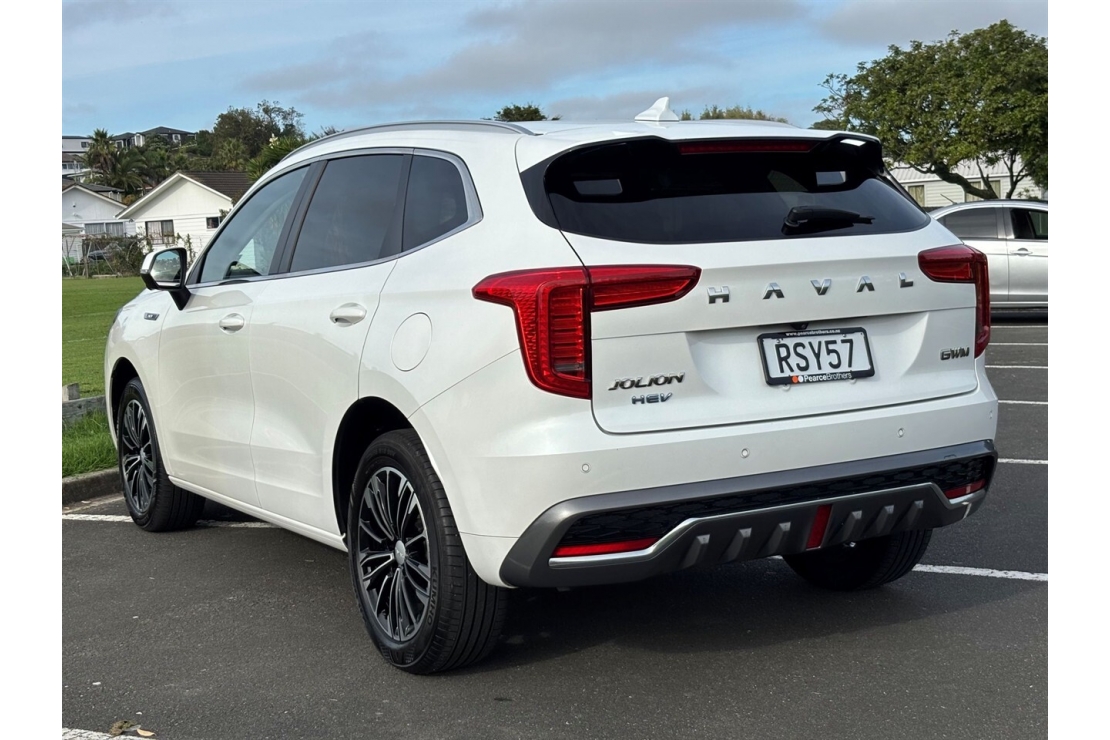 NZ new 2023 GWM Haval Jolion Ultra Hybrid in white is a modern SUV that delivers impressive fuel efficiency with smooth hybrid performance. Sitting on 18 inch alloys with tinted windows, this Jolion offers a sleek and practical design perfect for everyday driving.