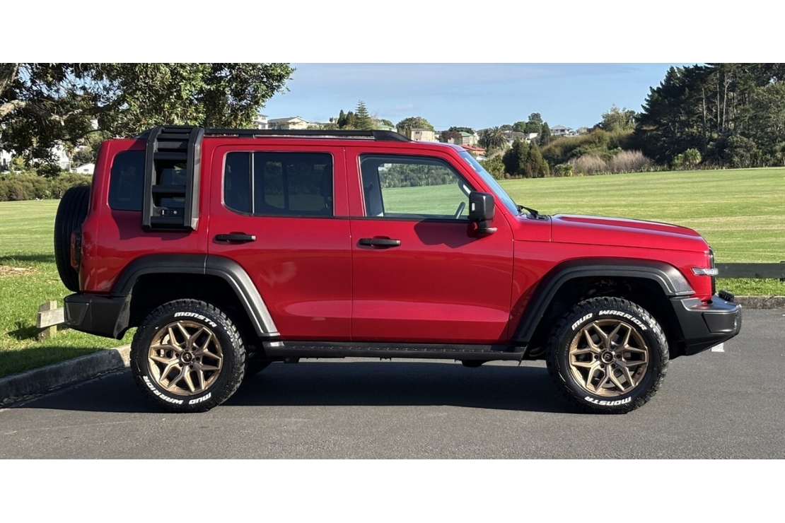 2025 GWM Tank 300 Ultra in metallic red with custom blackout styling is a rugged modern SUV built for serious off road capability and premium comfort. Sitting on 18 inch alloys with flared guards, running boards, and side ladder