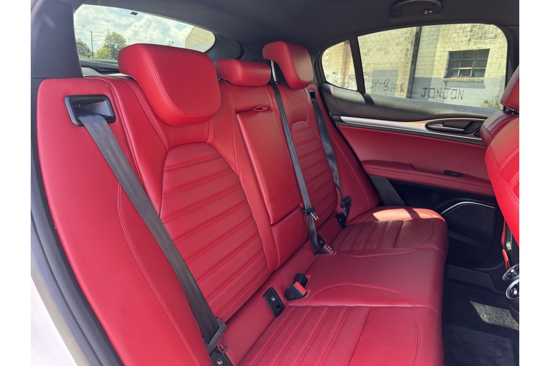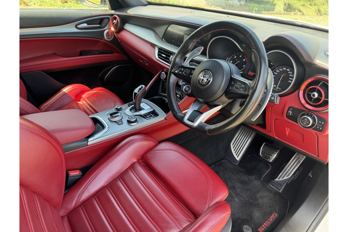 Finished with tinted windows, rear spoiler and sitting on striking 20 inch alloys, this Stelvio has unmistakable European presence. The dual rear exhaust outlets and sleek body styling highlight its sporty DNA, while the refined chassis and adjustable drive modes