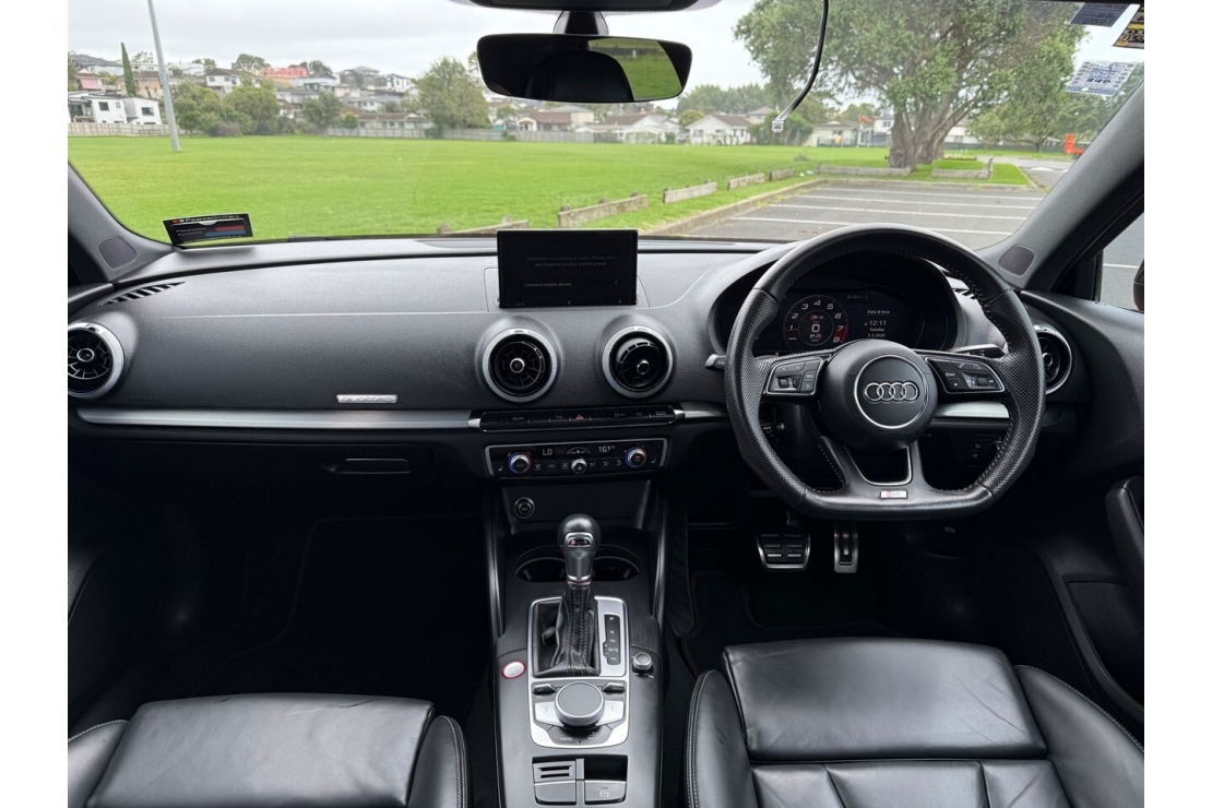 Inside, the cabin is premium and sporty with full black fine Nappa leather, Audi Virtual Cockpit, RS style instrument cluster, and a leather wrapped multifunction steering wheel with paddle shifters. Comfort and technology are well covered with adaptive cruise control, navigation, Bluetooth connectivity, and Audi smartphone interface.