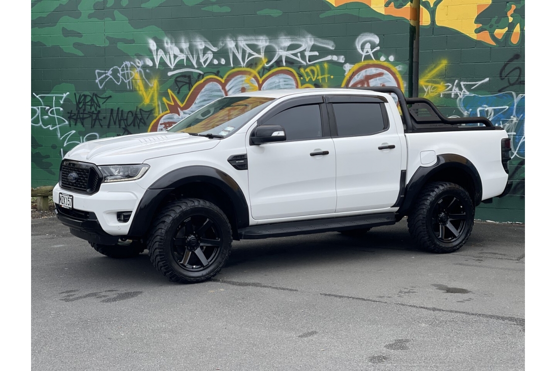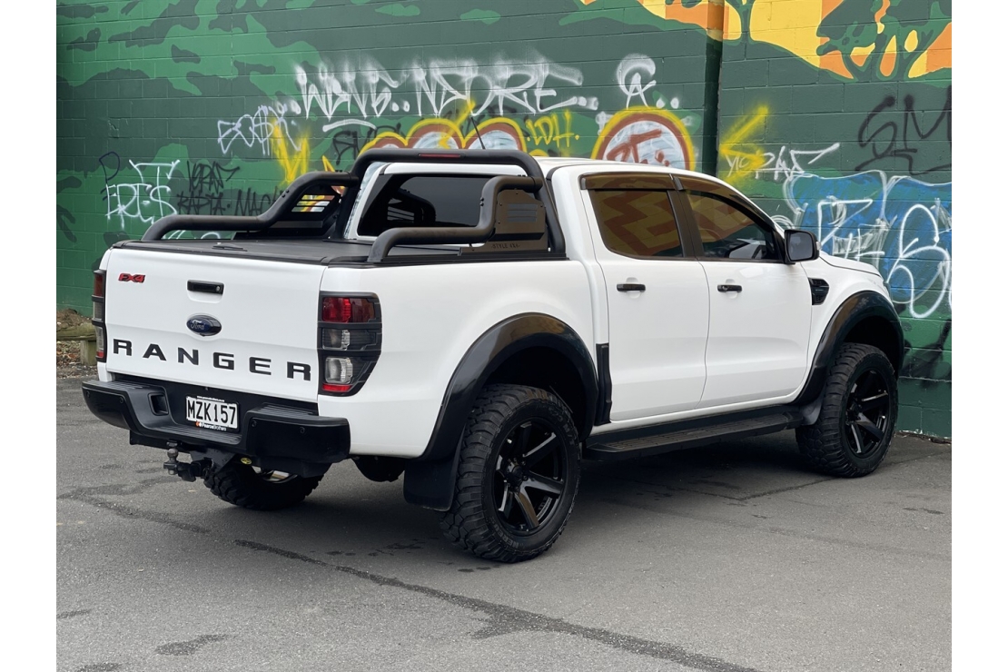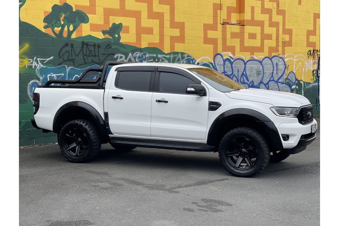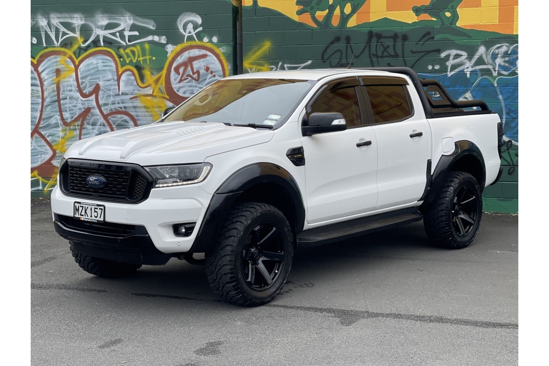 New Zealand new 2020 Ford Ranger FX4 presented in white with a custom blackout, sitting on 20 inch alloys. This tough looking double cab features flared guards, FX4 body kit styling, running boards, monsoon shields and a rear sports bar, giving it serious street presence.