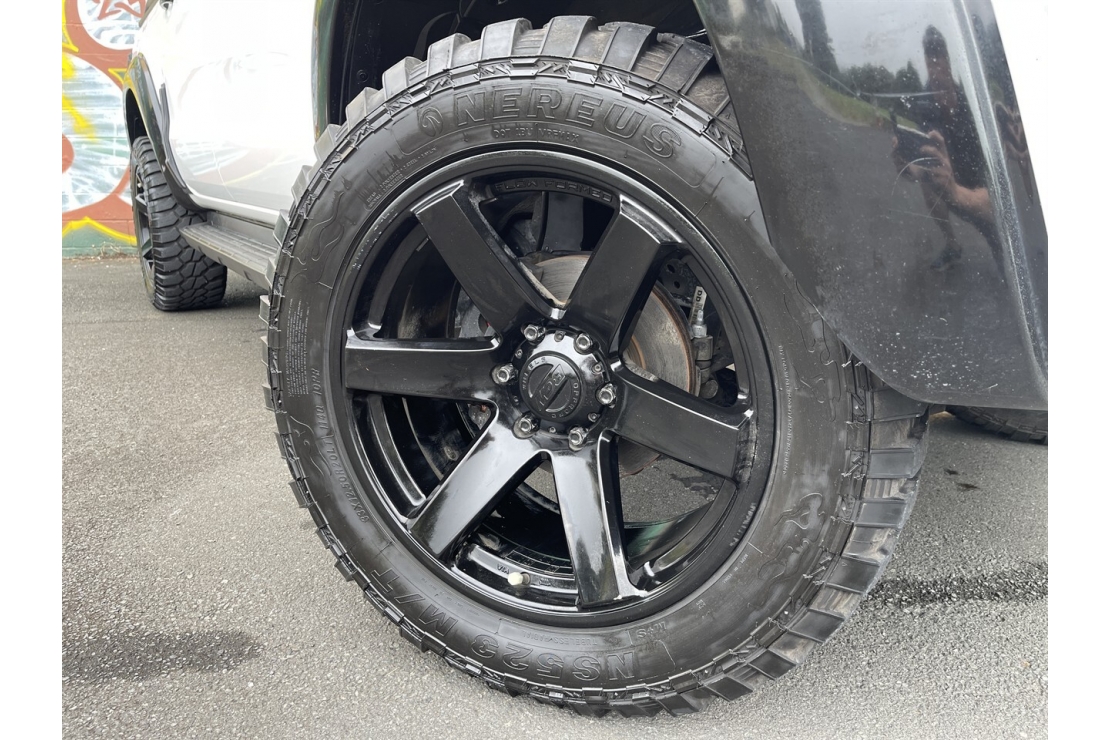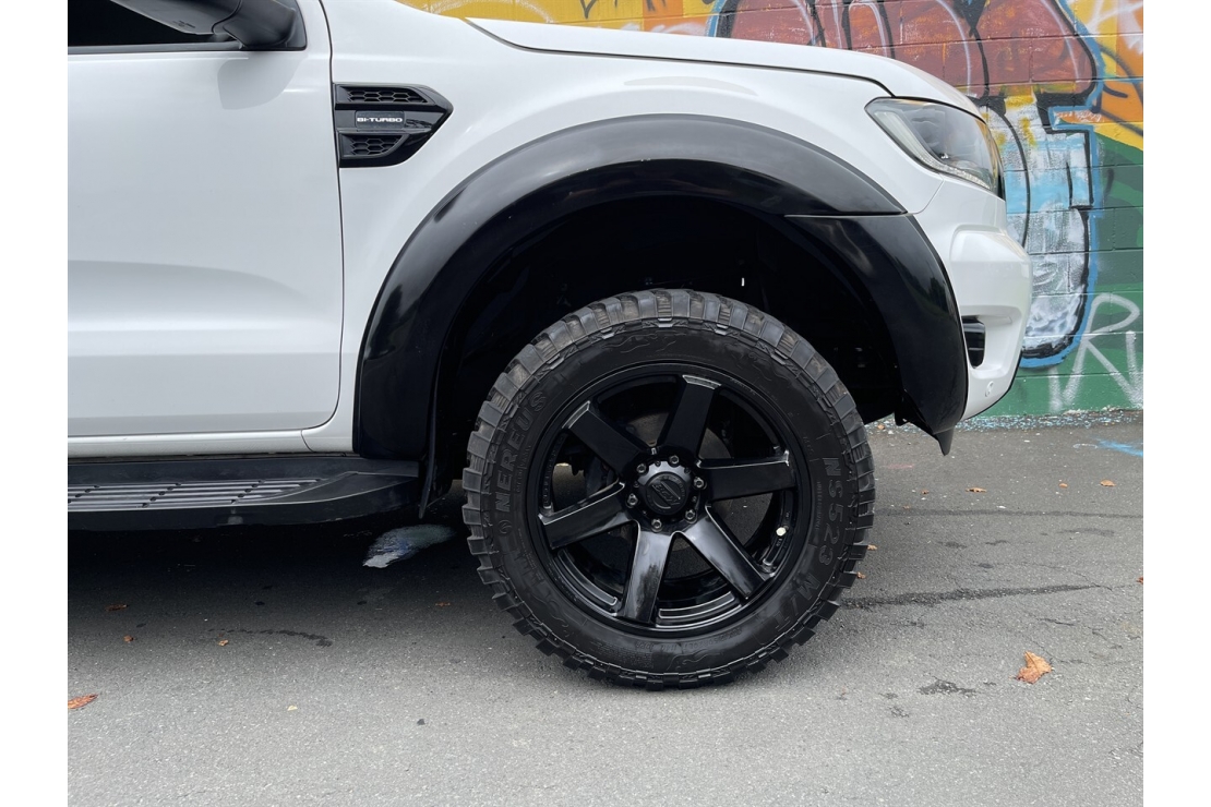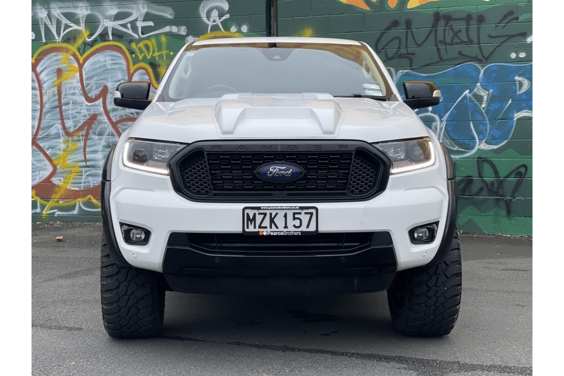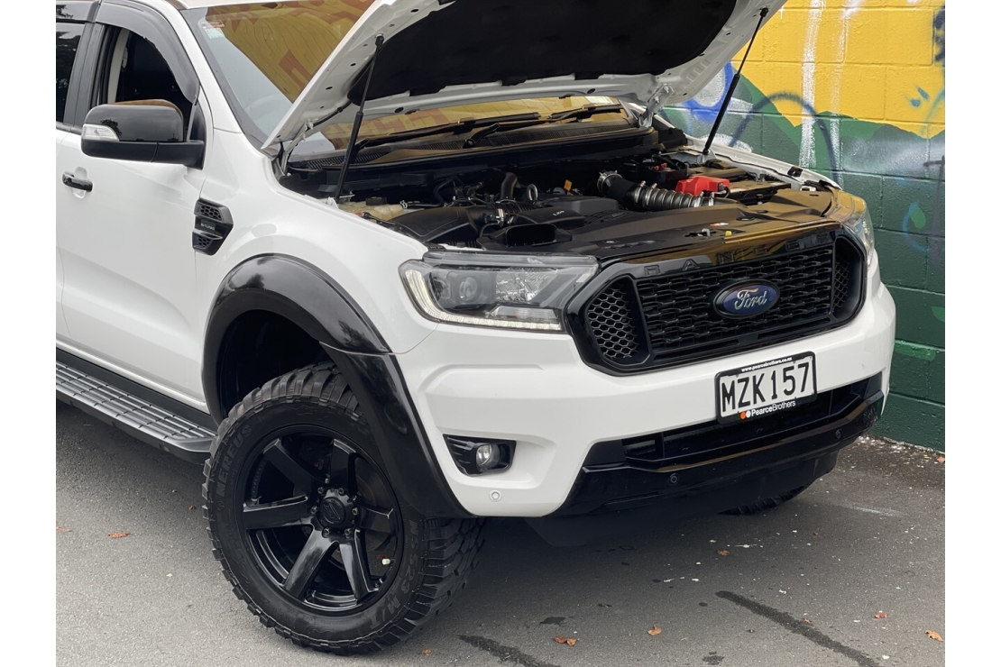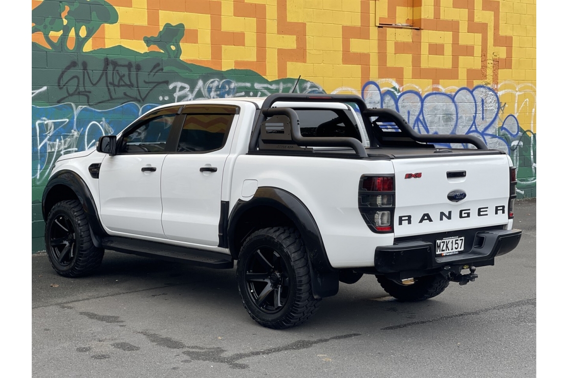 New Zealand new 2020 Ford Ranger FX4 presented in white with a custom blackout, sitting on 20 inch alloys. This tough looking double cab features flared guards, FX4 body kit styling, running boards, monsoon shields and a rear sports bar, giving it serious street presence.
