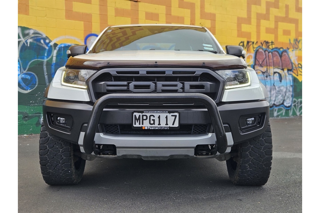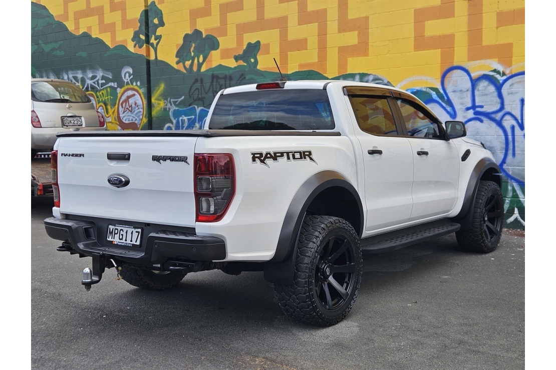 This 2019 Ford Ranger Raptor is a serious off road performance machine, finished in crisp white with a full custom blackout. Equipped with flared guards, twenty inch alloys, running boards, front nudge bar, monsoon shields, bonnet guard, deck liner and tow bar, it delivers that signature Raptor presence. The dual range four wheel drive system with diff lock