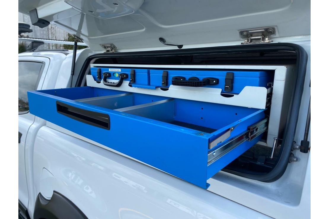 Fitted with a lockable canopy packed with professional-grade features, including multiple slide-out box drawers, shelving, and secure storage ideal for tools, parts, or equipment.