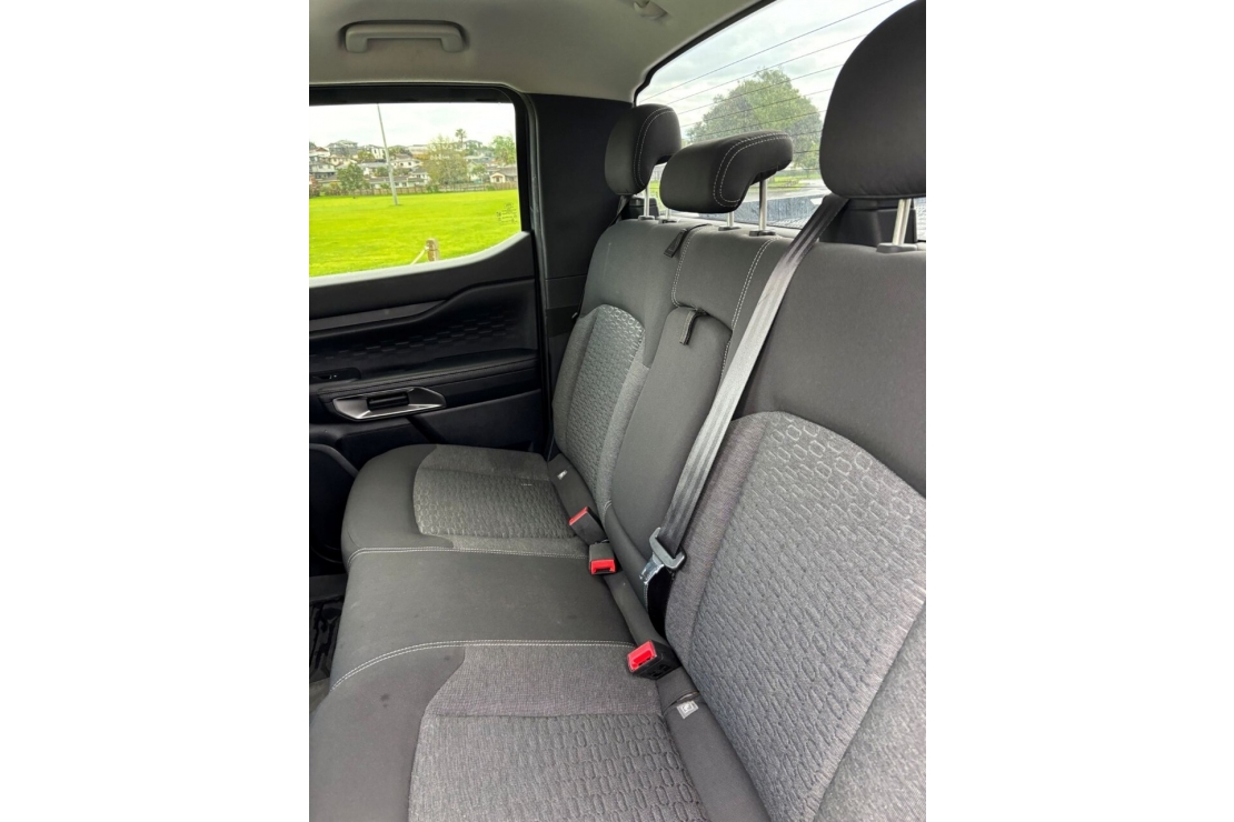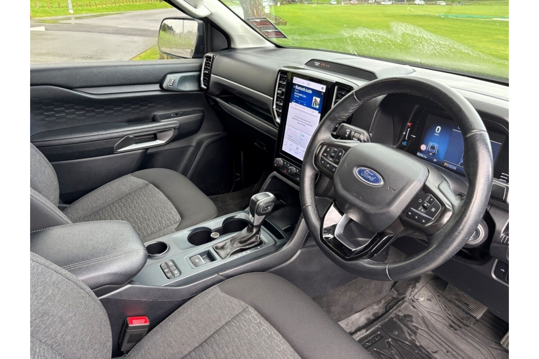 This Ranger is fitted with a locking alloy hardlid, tow bar, running boards, monsoon shields, and wellside sports bars, making it practical and stylish. Safety and driver tech includes ABS, traction control, stability control, adaptive cruise control, multiple airbags, forward collision warning, distance alert, ISOFIX child seat anchors, and an integrated brake controller.