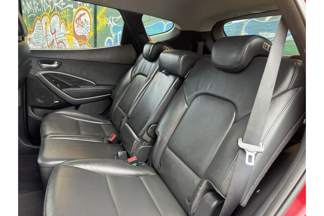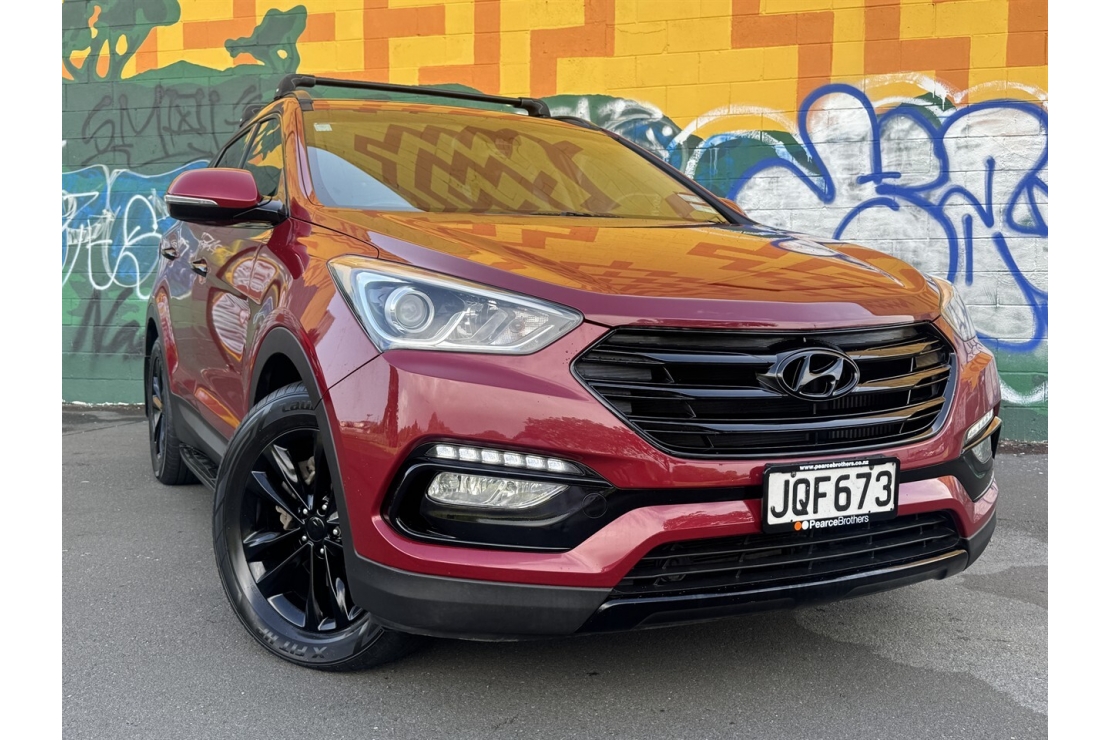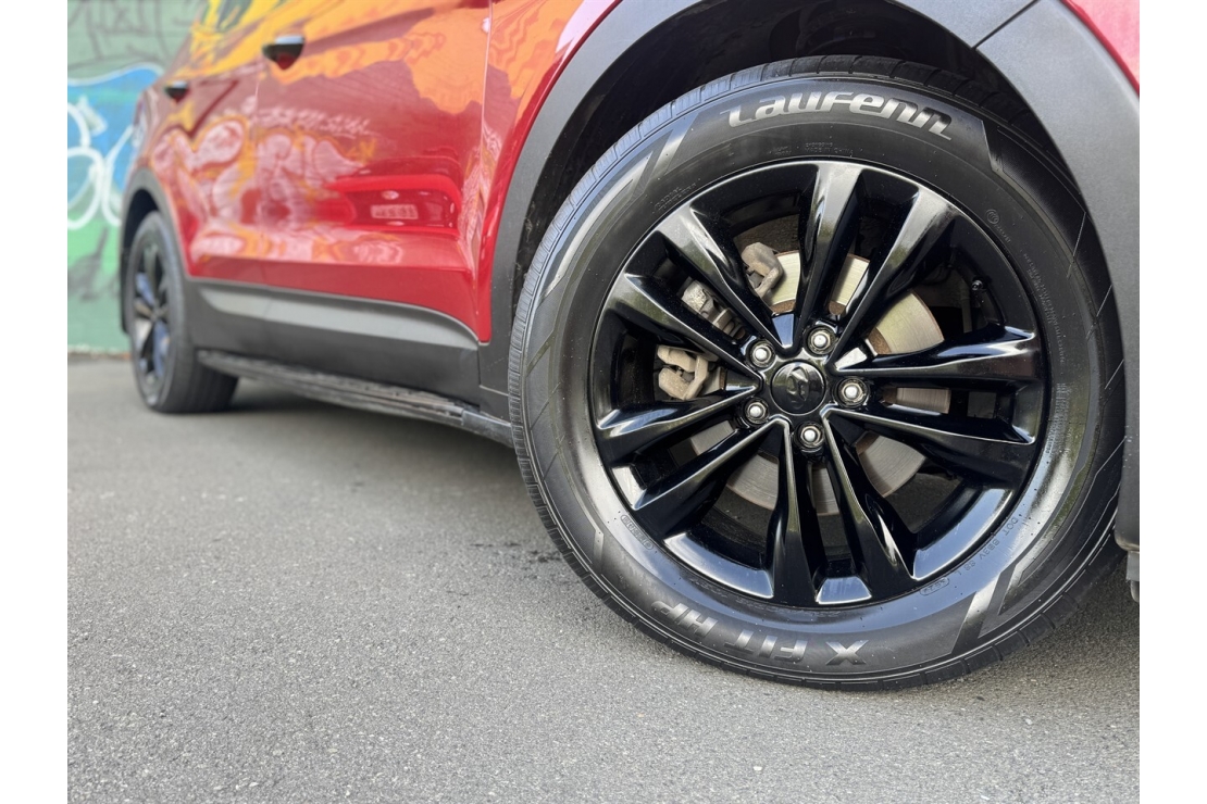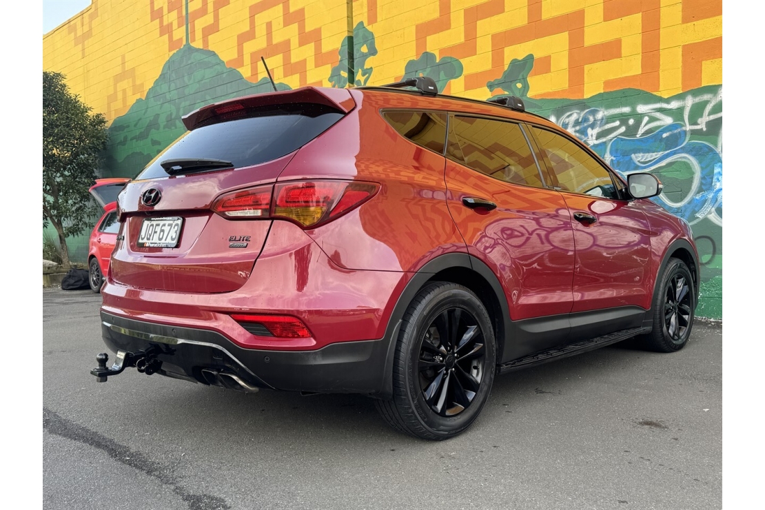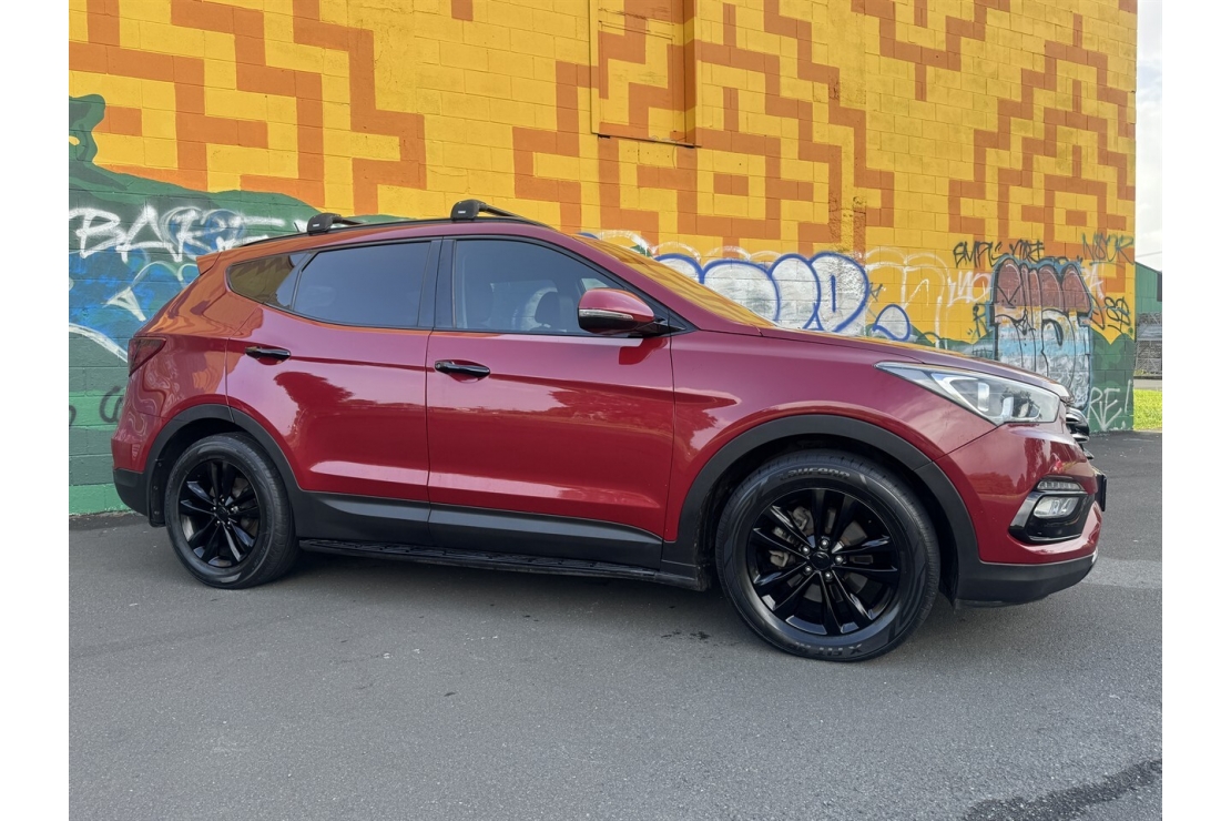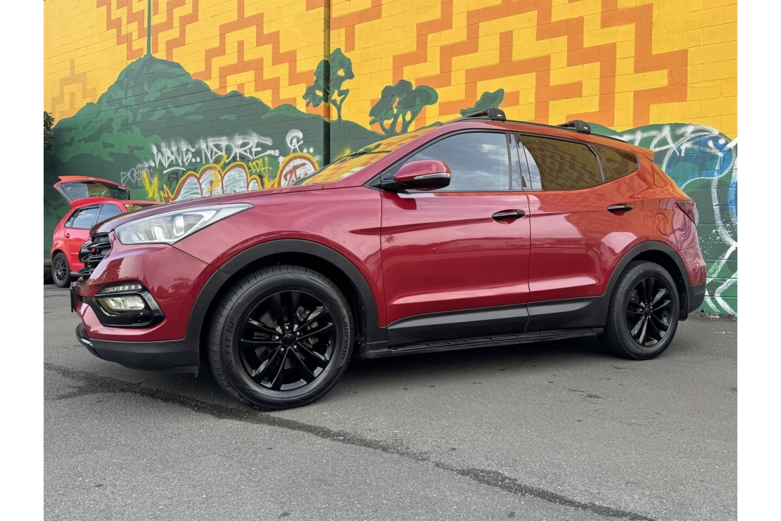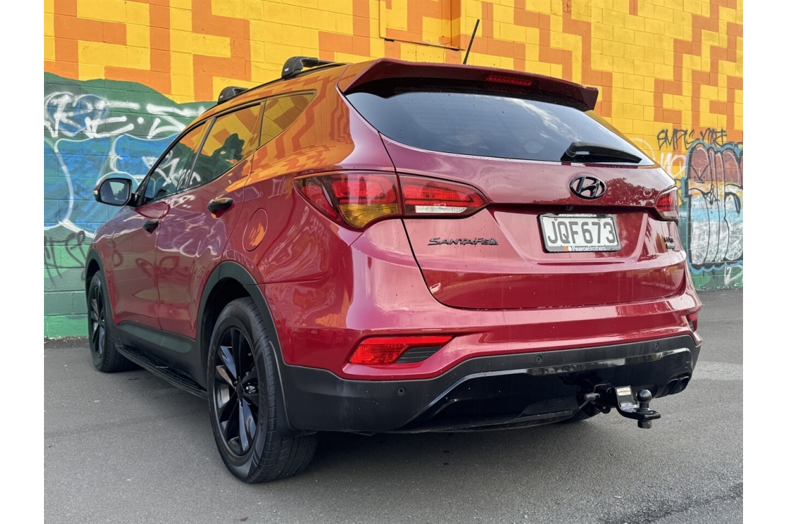 Finished in red with a custom blackout, this Santa Fe presents smartly and is equipped with 4x4 traction, making it well suited to towing, road trips, and everyday driving. Exterior features include running boards and a tow bar, adding both style and practicality.
