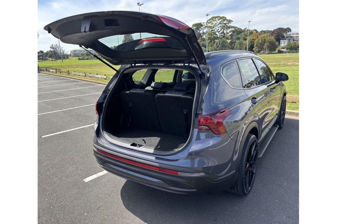 NZ new 2021 Hyundai Santa Fe TM in metallic grey with custom blackout styling is a modern and spacious 7 seater SUV. Sitting on 20" alloy wheels and tyres with tinted windows, running boards, and rear spoiler