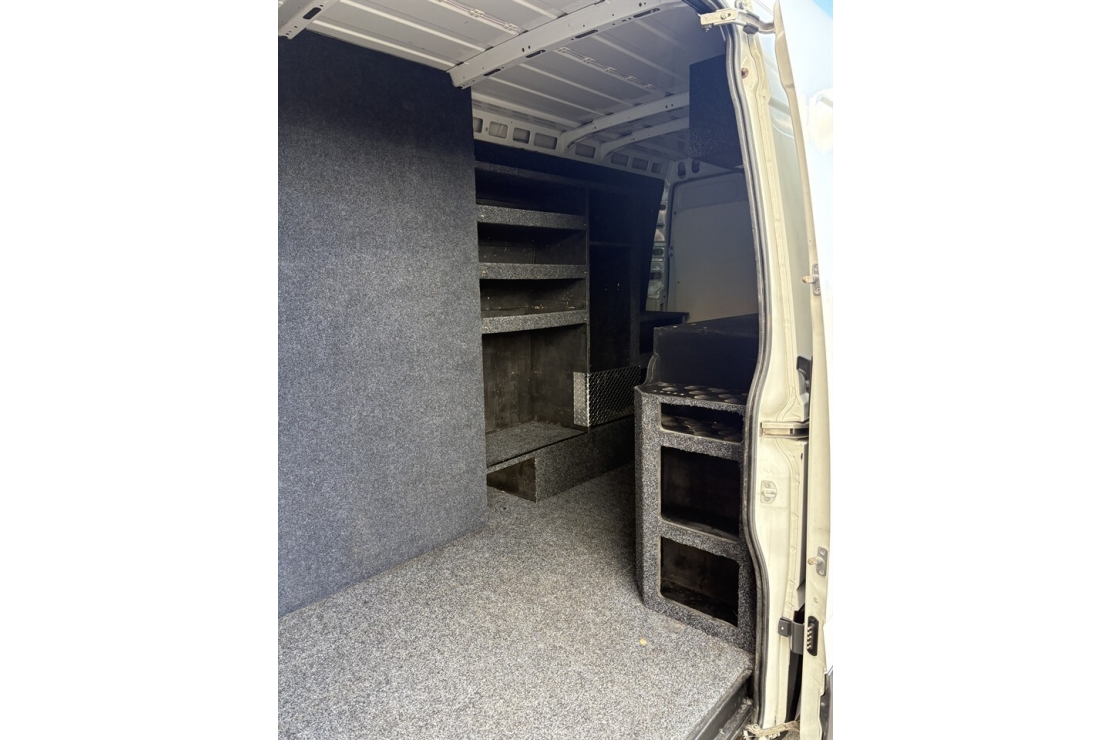Finished in clean White, this example comes complete with twin sliding side doors and practical rear barn doors for easy access no matter how youre loaded. Inside, its kitted out with a custom trade fit-out, including shelving... Read more