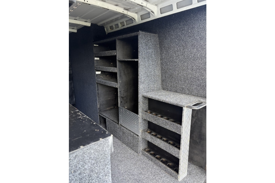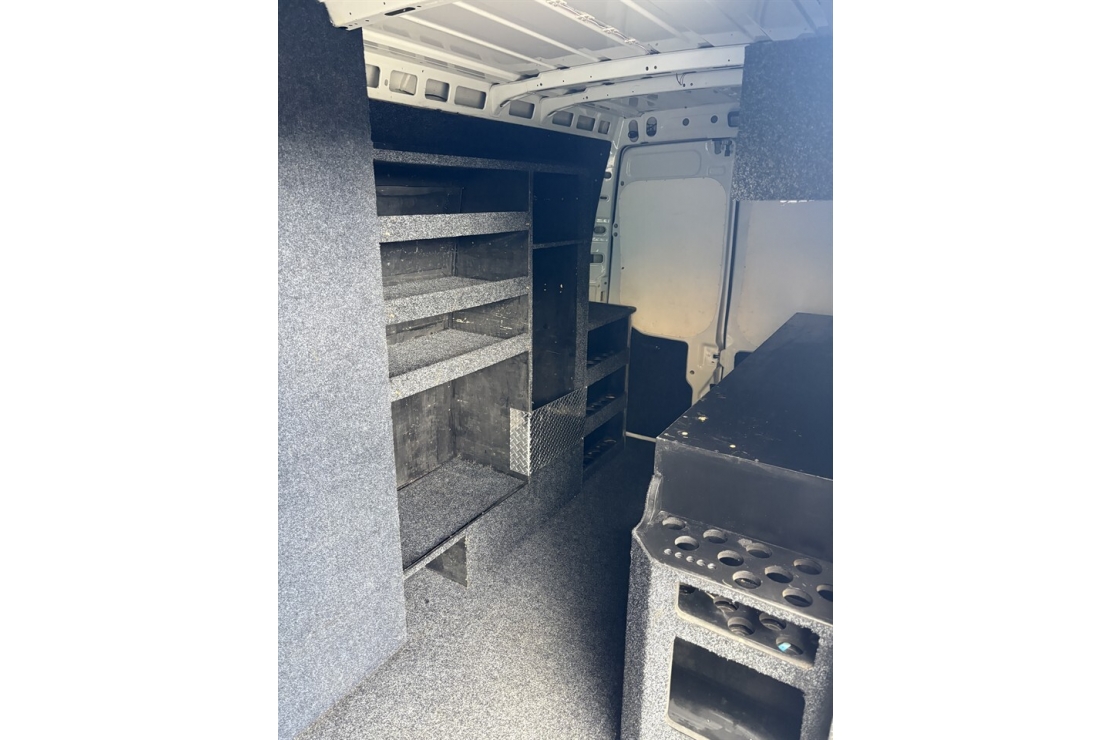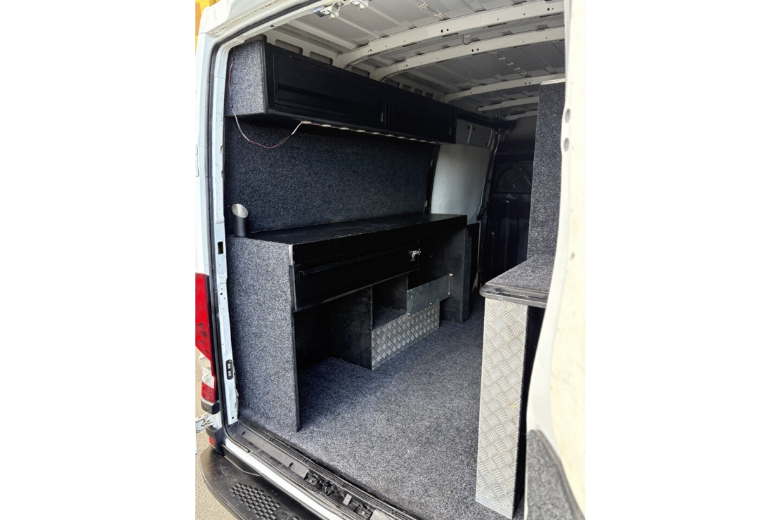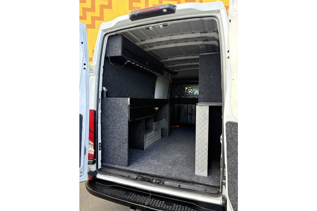 Finished in clean White, this example comes complete with twin sliding side doors and practical rear barn doors for easy access no matter how youre loaded. Inside, its kitted out with a custom trade fit-out, including shelving, a workbench, and storage drawers the perfect solution for tradies, contractors, or businesses needing a mobile workshop. Added practicality comes with a reversing camera, tow bar, and spacious rear setup that maximises productivity.