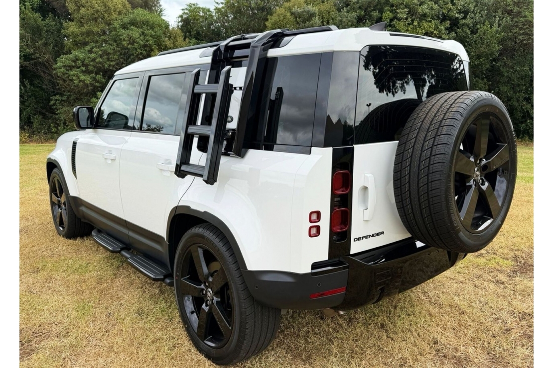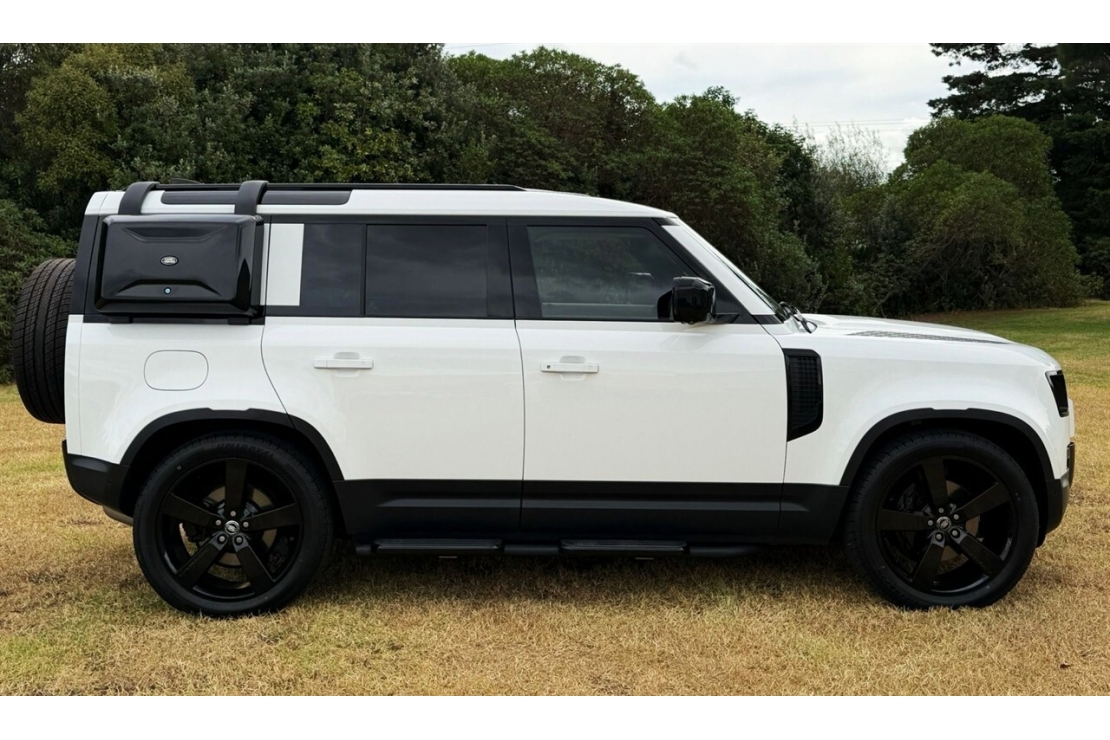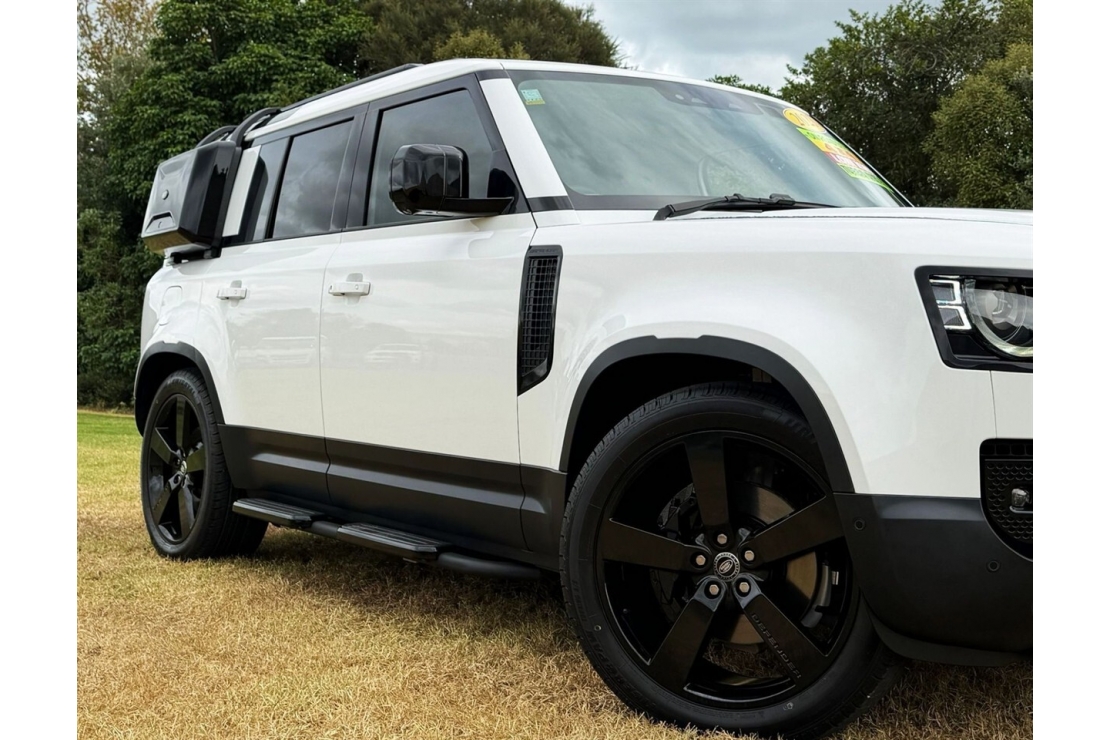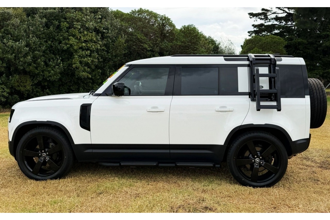 This 2023 Land Rover Defender 110 D300 S combines modern efficiency with legendary four wheel drive capability. Powered by a 3.0 litre turbo diesel engine paired with an 8 speed automatic transmission, it delivers strong performance, smooth power delivery and excellent refinement. Finished in striking Metallic Fuji White with a premium Taurus leather interior, this Defender stands out with a full custom blackout, upgraded 22 inch alloys, side mounted storage box and ladder rack for added practicality and rugged appeal.