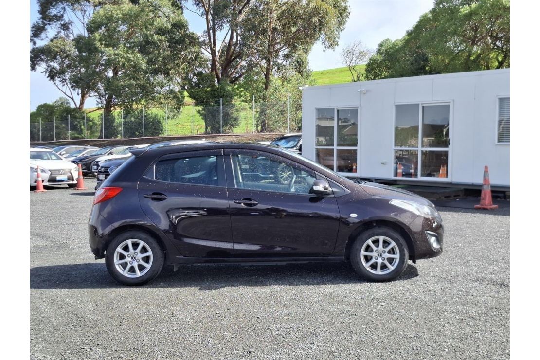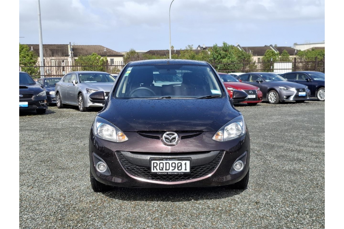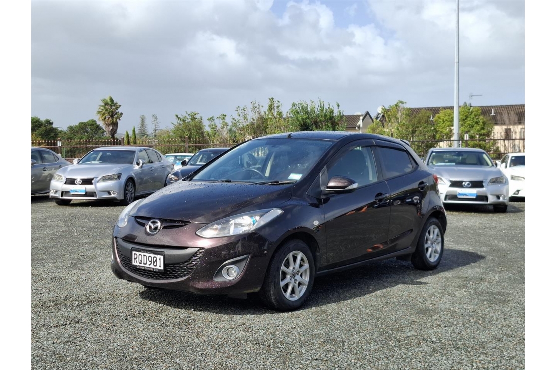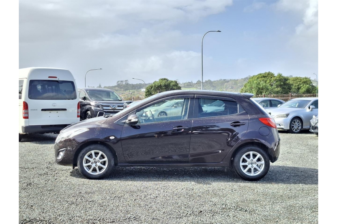 2014 Mazda Demio hatchback in red wine colour with dark interior.