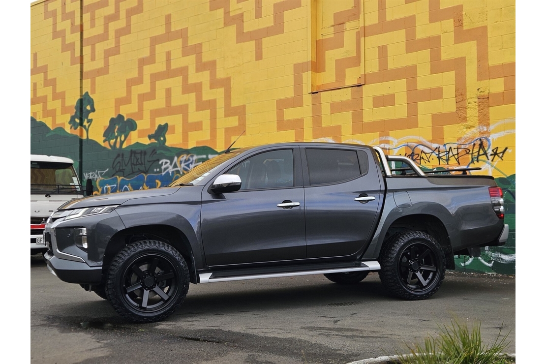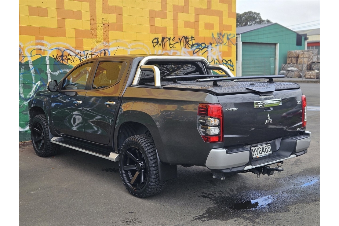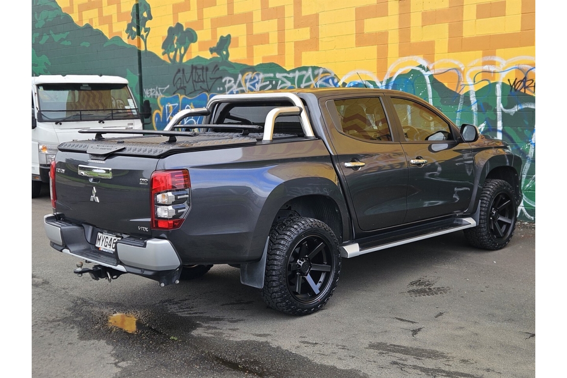 This top-spec NZ New Triton VRX is a tough, stylish double cab ute that blends rugged capability with premium comfort. Finished in Metallic Grey with a full custom blackout treatment, rear sports bars, running boards, and brand new 20" alloys wrapped in all terrain tyres.