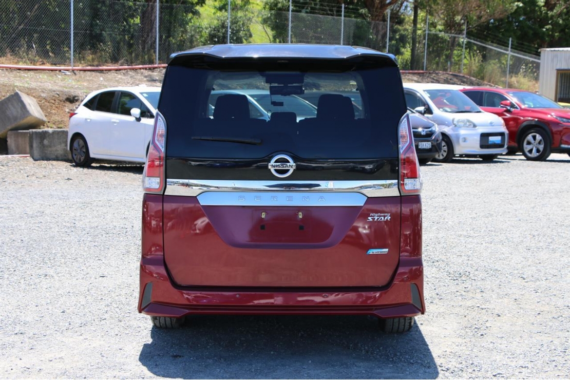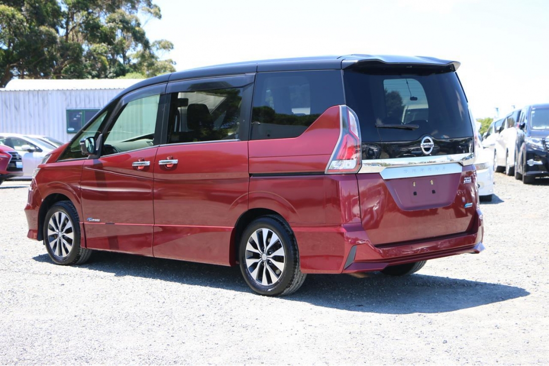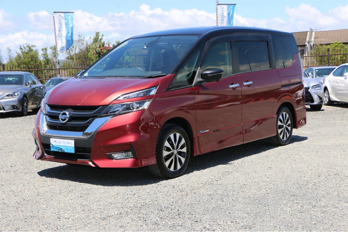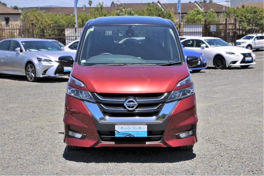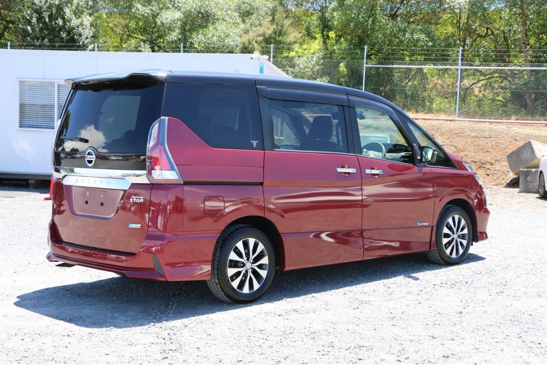 Top spec 2018 Nissan Serena G Hybrid Highway Star 8 seater in Red Wine colour with black seats.