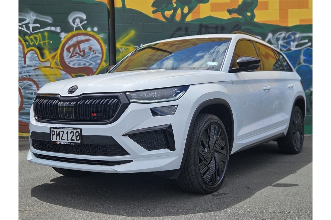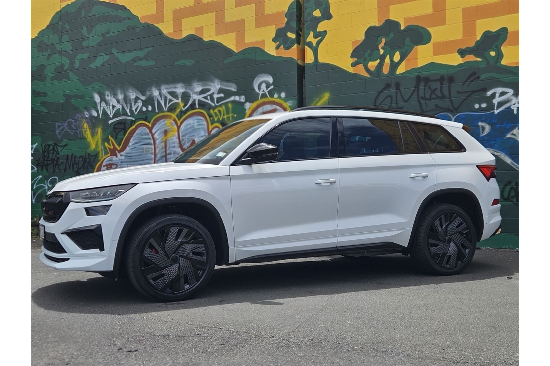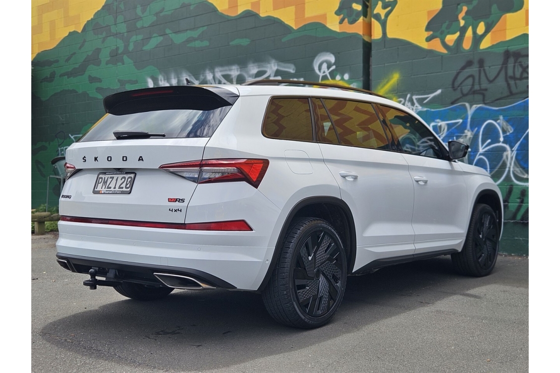New Zealand New 2022 Skoda Kodiaq RS finished in metallic white with a bold custom blackout. Powered by the strong 2.0 litre turbo petrol engine producing 180 kW and paired with a four wheel drive system, this RS delivers confident performance in all conditions. A true seven seater SUV that blends RS performance with family practicality.