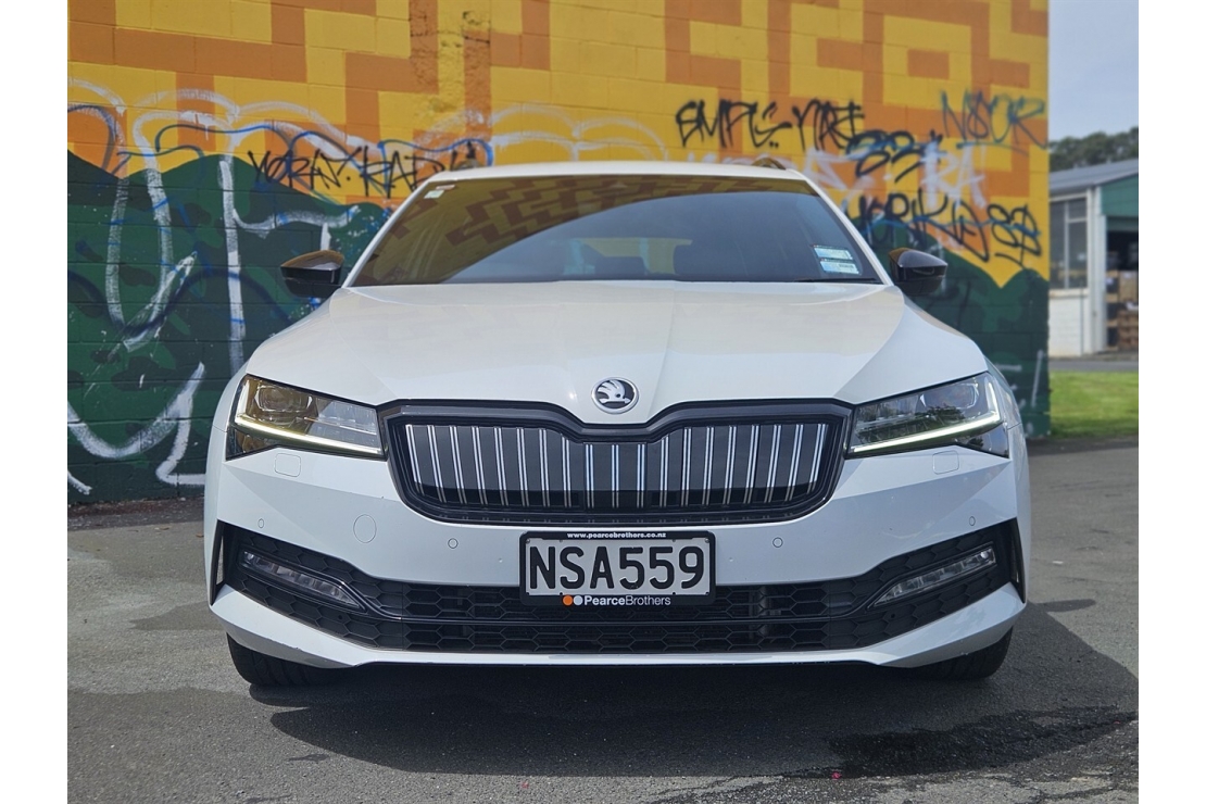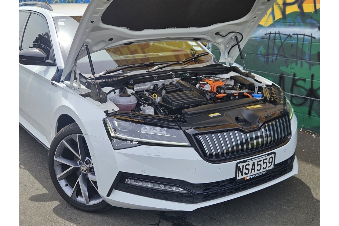 Experience the perfect balance of power, technology, and European luxury with this stunning NZ New 2021 Skoda Superb Sportline IV Plug-In Hybrid. Finished in sleek Metallic Moon White and sitting on 19 inch VEGA Anthracite polished alloys.