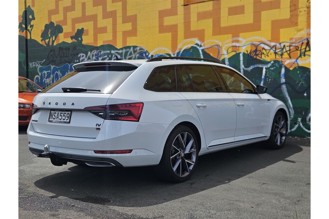 Experience the perfect balance of power, technology, and European luxury with this stunning NZ New 2021 Skoda Superb Sportline IV Plug-In Hybrid. Finished in sleek Metallic Moon White and sitting on 19 inch VEGA Anthracite polished alloys.