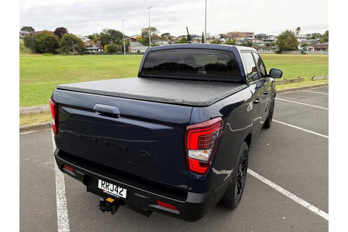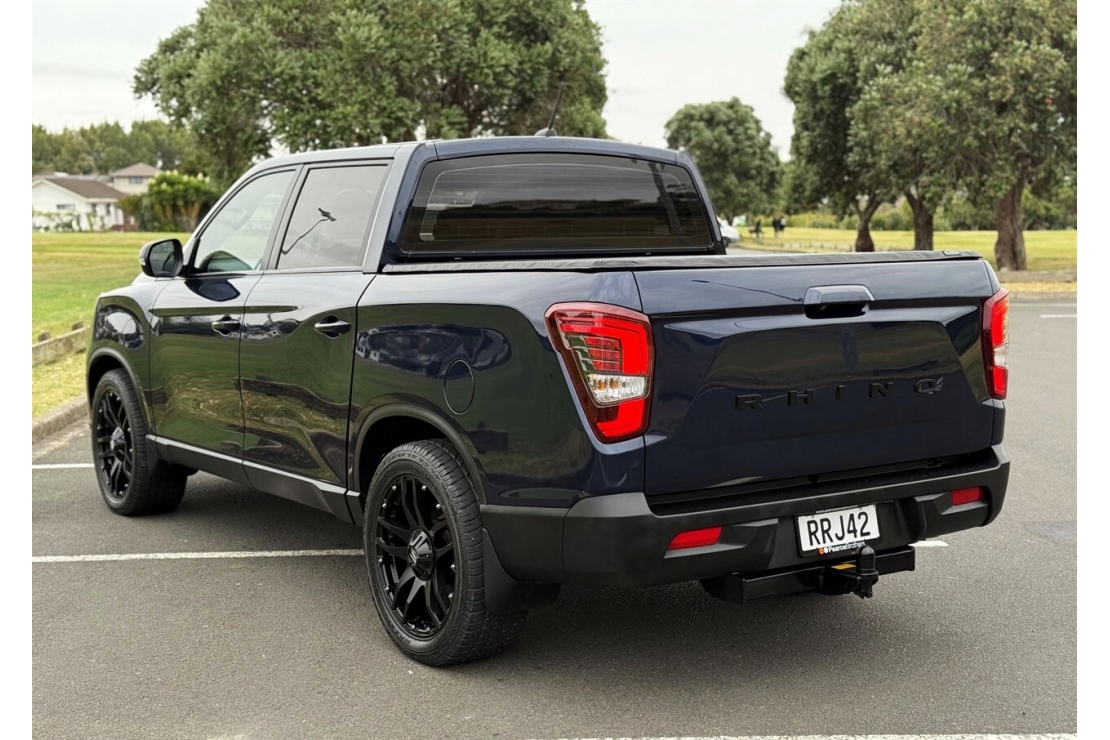 NZ new 2022 SsangYong Rhino in metallic blue with custom blackout styling is a tough modern ute that delivers strong performance and excellent practicality. Sitting on bold 20 inch alloy wheels with tinted windows and bonnet guard fitted.Tonneau cover and deck liner