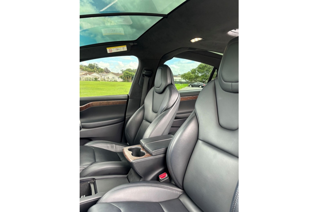 Full black leather interior, digital driver display, and Teslas signature large touchscreen infotainment system, controlling navigation, media, vehicle settings, and connectivity. The premium audio system delivers exceptional sound quality, while the spacious layout and panoramic glass roof