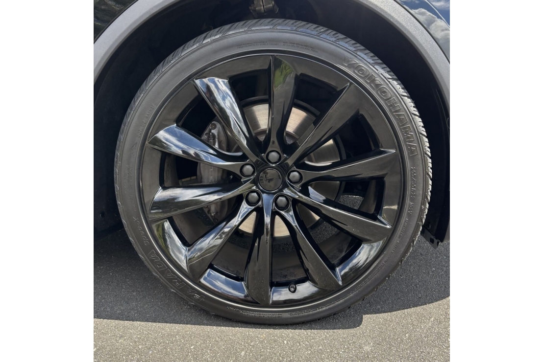 2019 Tesla Model X 100D is finished in Black with a custom blackout on 22 inch alloy wheels. With tinted windows, rear spoiler, and the iconic full glass panoramic roof