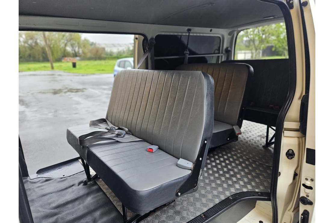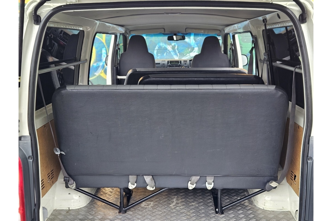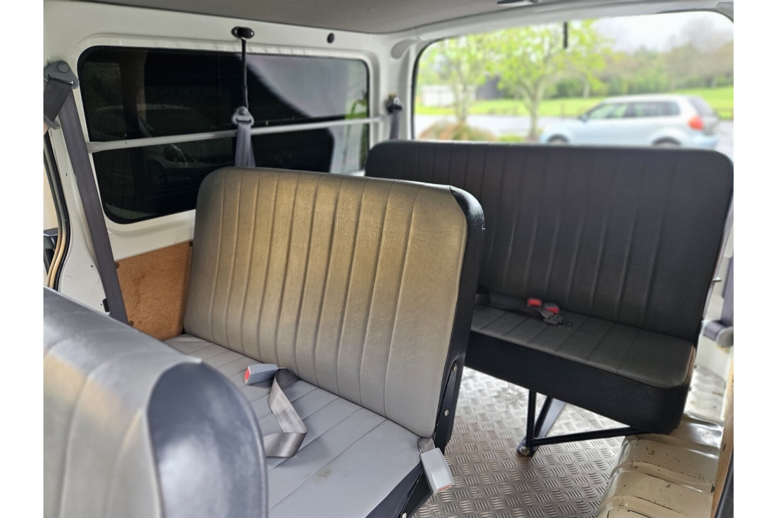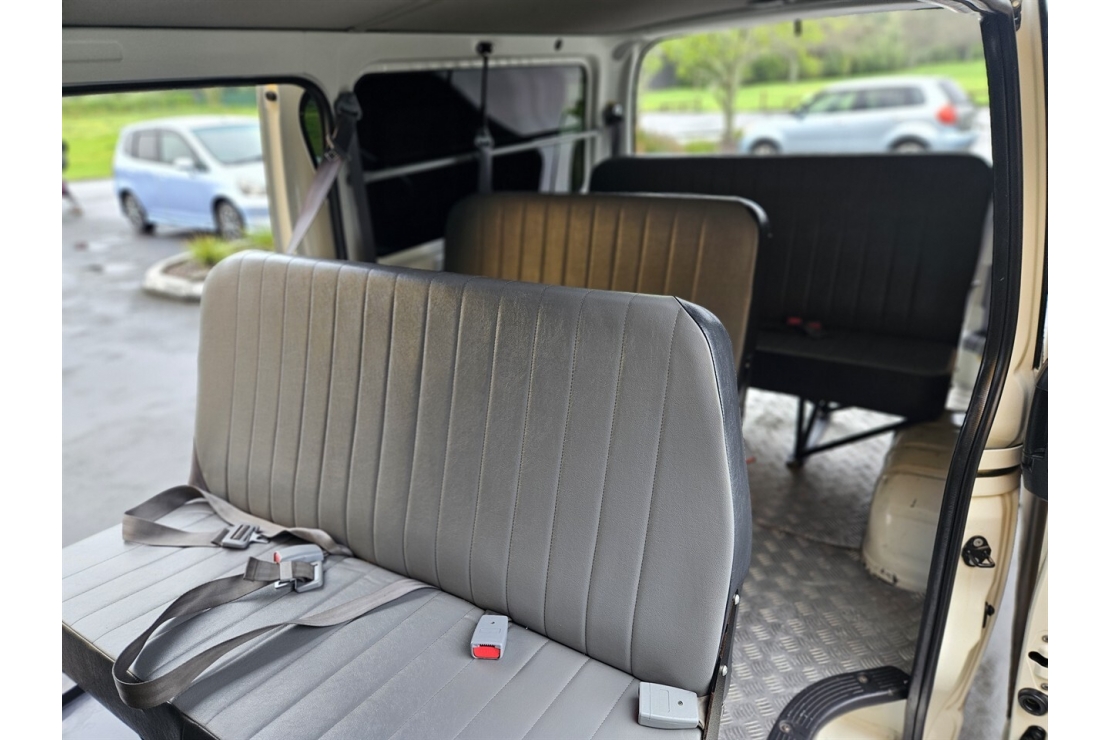 Finished in classic white, this Hiace features dual sliding doors for easy access from either side, making passenger entry and exit hassle-free. Inside, theres seating for eleven in comfort, with a well-designed layout for both passengers and luggage. Recently serviced with a brand-new WOF and a well-maintained history including the timing chain replaced at 63,000km, this van is ready to go to work.