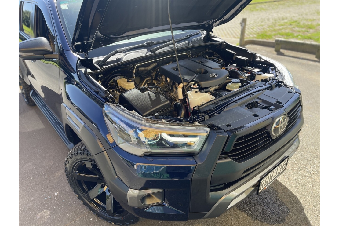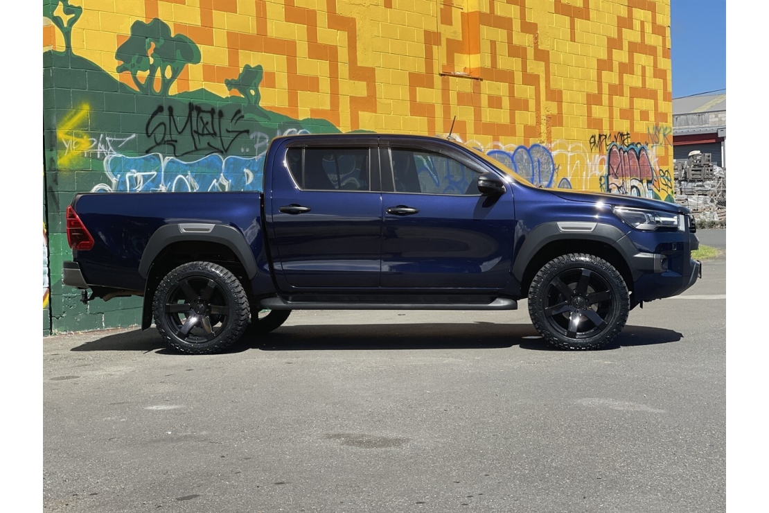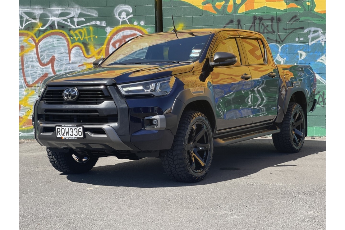 This NZ New 2021 Toyota Hilux SR5 Cruiser is a premium double cab that blends rugged capability with top spec comfort. Powered by the proven 2.8L turbo diesel engine with Tiptronic automatic transmission , it delivers serious pulling power and reliability. Finished in metallic blue with a full custom blackout, flared guards and sitting on brand new 20 inch alloys wrapped in all terrain tyres, this Hilux has outstanding road presence.