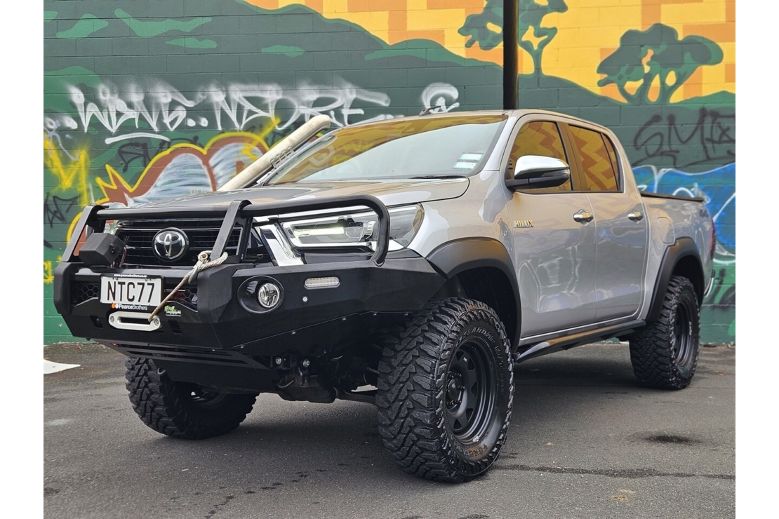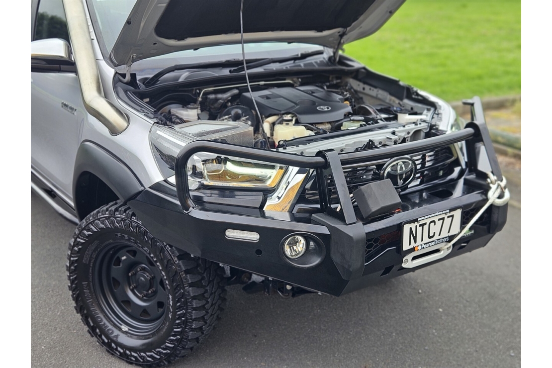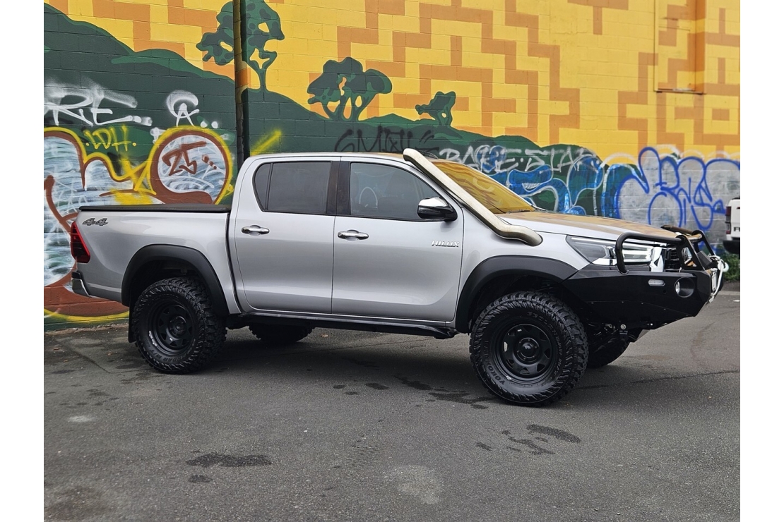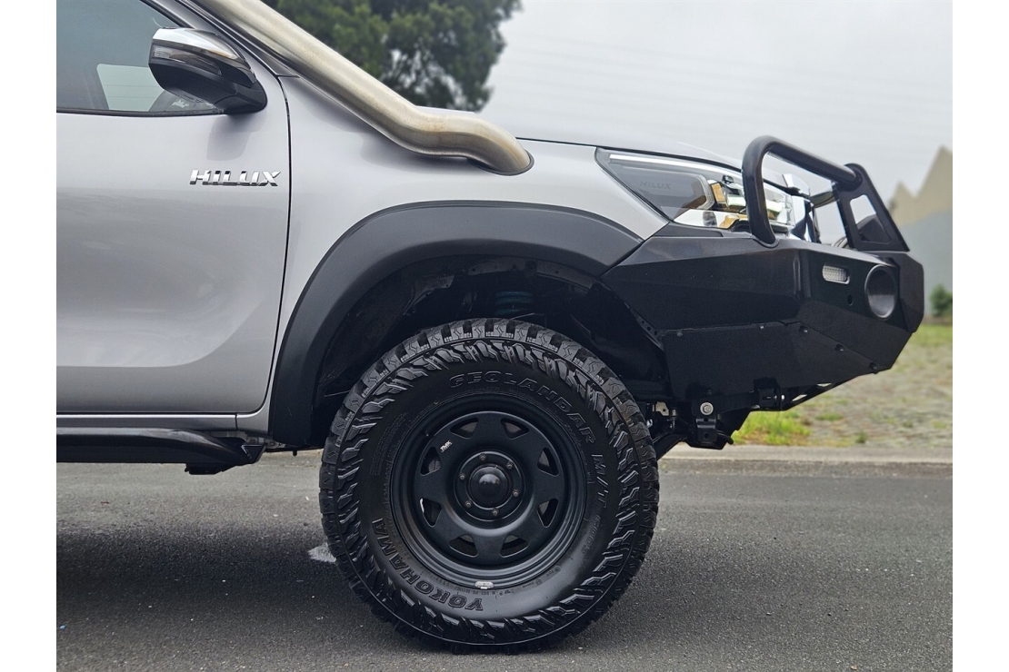 This Hilux has been professionally set up and all modifications are certified. Sitting on 17 inch steel wheels with brand new all terrain tyres, it features a full alloy front bullbar and bumper with electric winch, stainless steel snorkel, alloy side steps, flared guards and a professionally fitted 2 inch lift kit. A tonneau cover and deck liner protect the tray, while tinted windows complete the tough look.