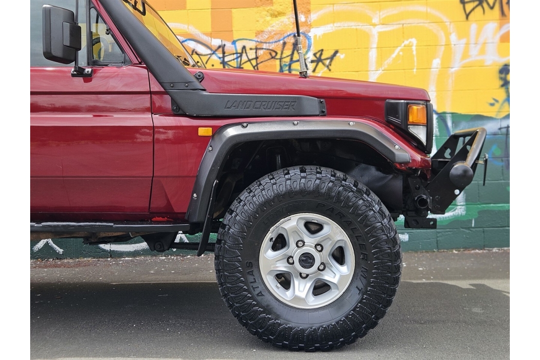 Finished in classic red, this two-door Land Cruiser is fitted for serious use with a steel flat deck with folding sides, front bull bar, snorkel, and LED light bar. It also includes platform roof racks for additional storage, 16-inch alloy wheels, running boards, and a tow bar for added versatility.