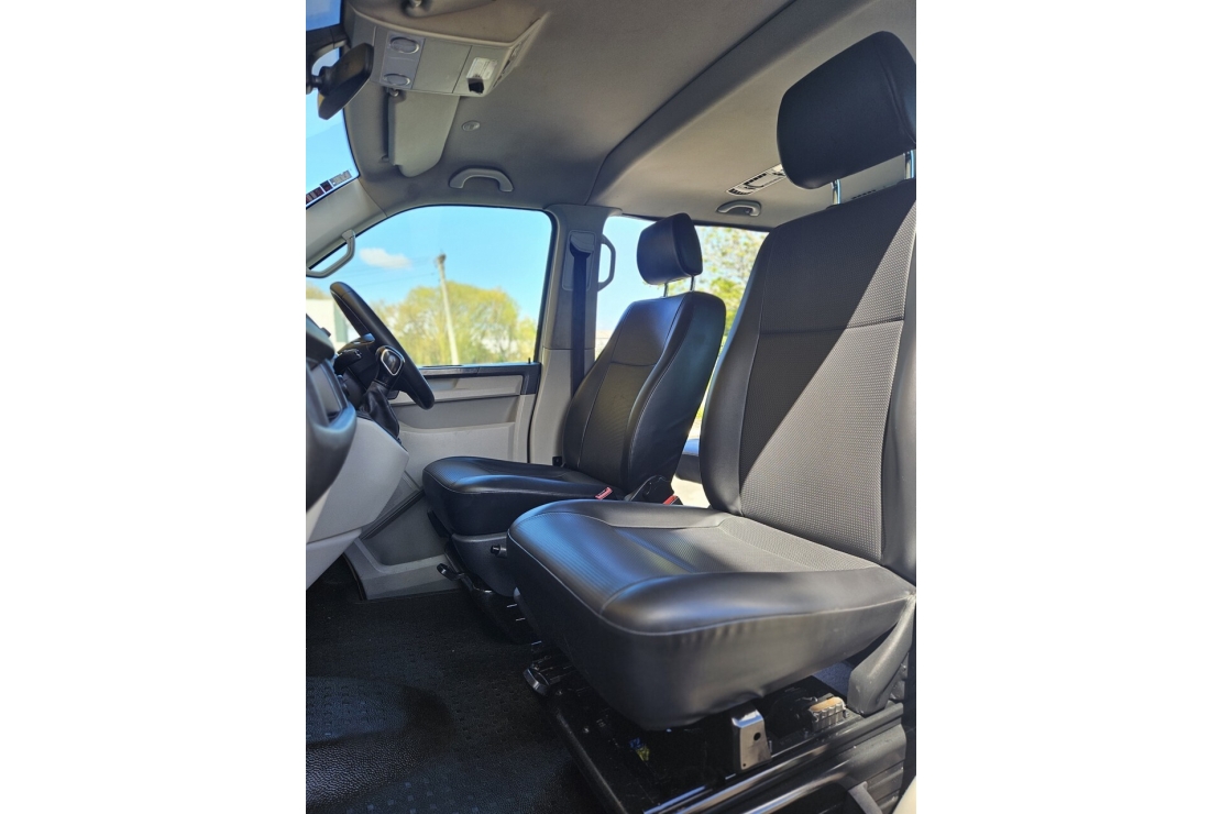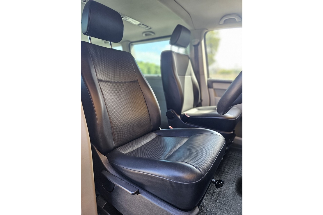 Inside, the flexible seating system with modular mounts and removable benches provides adaptable space for passengers or cargo. Comfort and safety are key with ISOFIX child seat anchors, heavy-duty shock absorption, and VWs advanced stability systems including ESC, ABS, ASR, electronic diff lock, hill start assist, and brake assist.