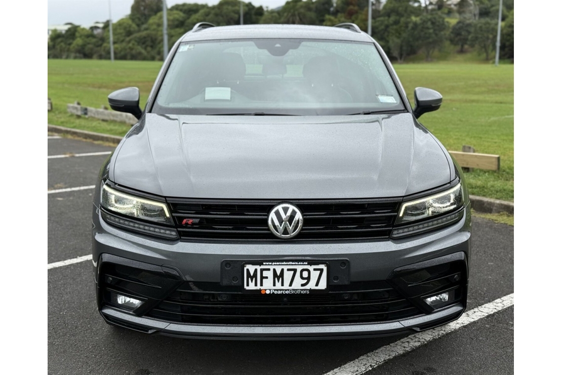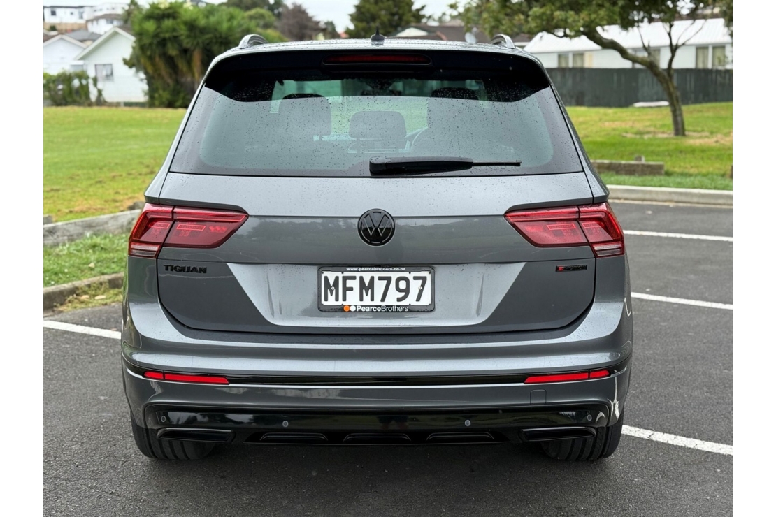 New Zealand New and finished in Metallic Grey with a custom blackout, this 2019 Volkswagen Tiguan TSI R-Line 4Motion is a sharp, high spec four wheel drive SUV sitting on 20 inch alloys with tinted windows and rear spoiler.