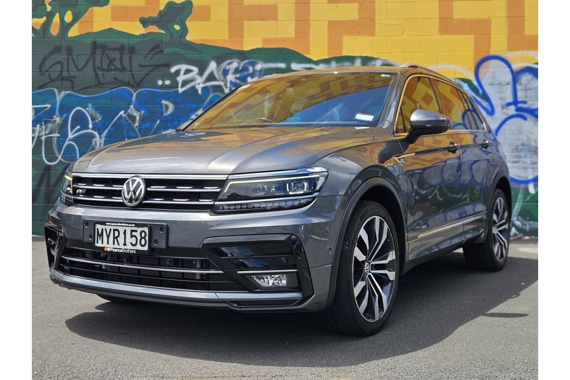 This is a New Zealand New 2020 Volkswagen Tiguan TSI R Line 4Motion, finished in metallic Indium Grey with a titanium black interior, sitting on striking 20 inch alloy wheels. A high spec performance SUV combining sporty R Line styling with advanced all wheel drive capability and everyday comfort.